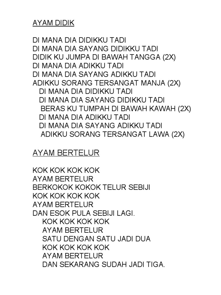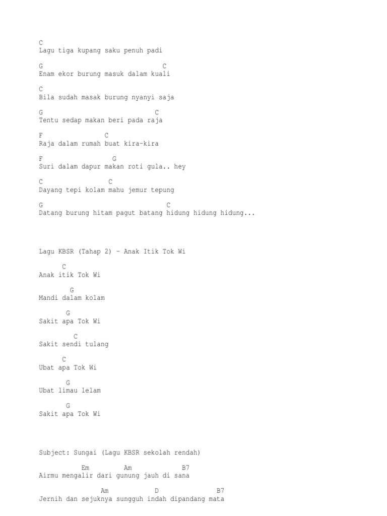 Seni Kata Lagu KBSR Tahun 2. Sing ono maning hang isun welasi sing ono maning hang isun sayangi kembang hang ono ring tangan ilang kepetik wong liyan tego tegane ninggal sun. Kebetulan minggu lepas sorang cikgu di sekolah saya minta tolong saya dapatkan lagu-lagu untuk Subjek Pendidikan Kesenian Tahun 1.